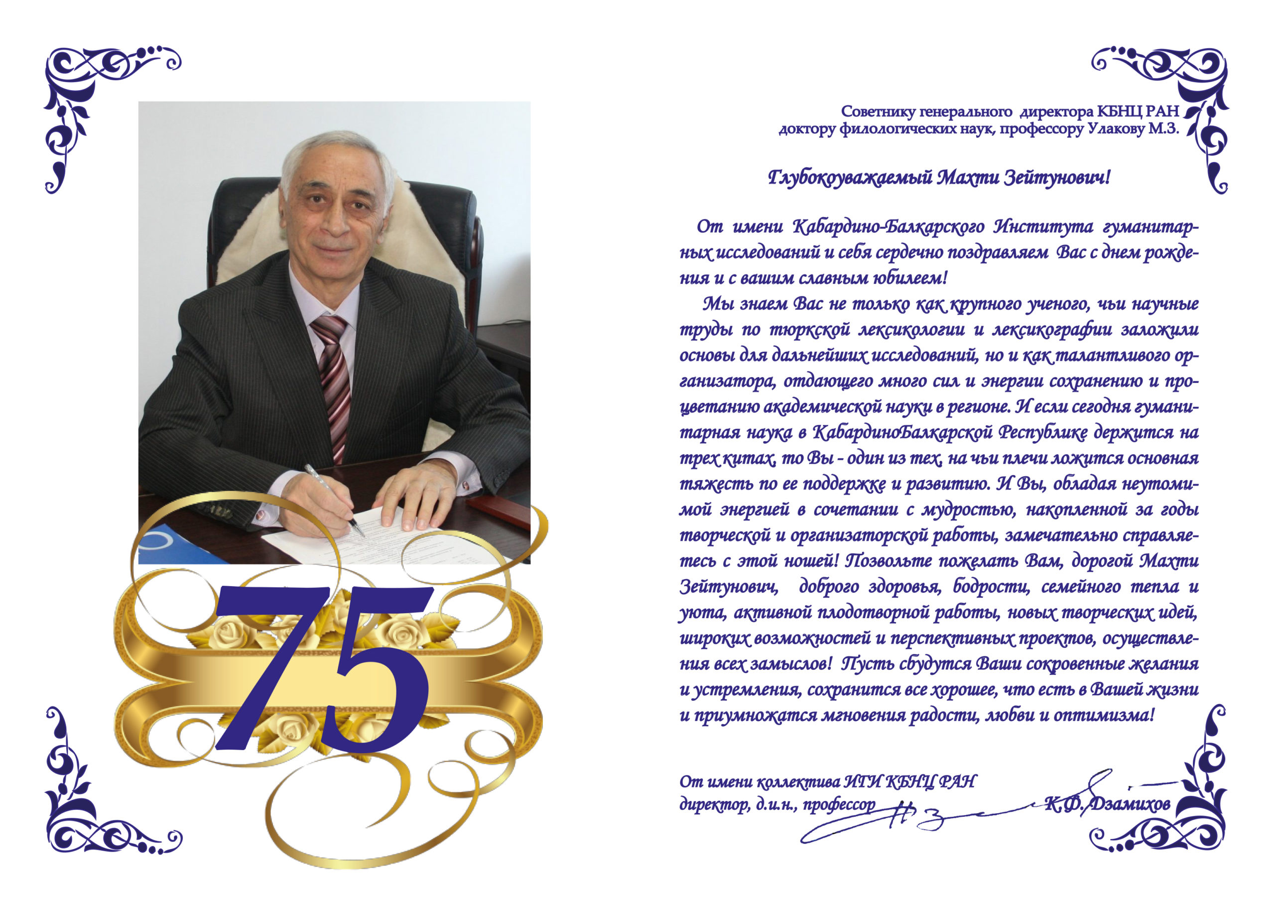 Коллектив ИГИ КБНЦ РАН поздравляет главного научного сотрудника сектора адыгского фольклора, Заслуженного деятеля науки КБР, доктора филологических наук, профессора Гутова Адама Мухамедовича с юбилеем!